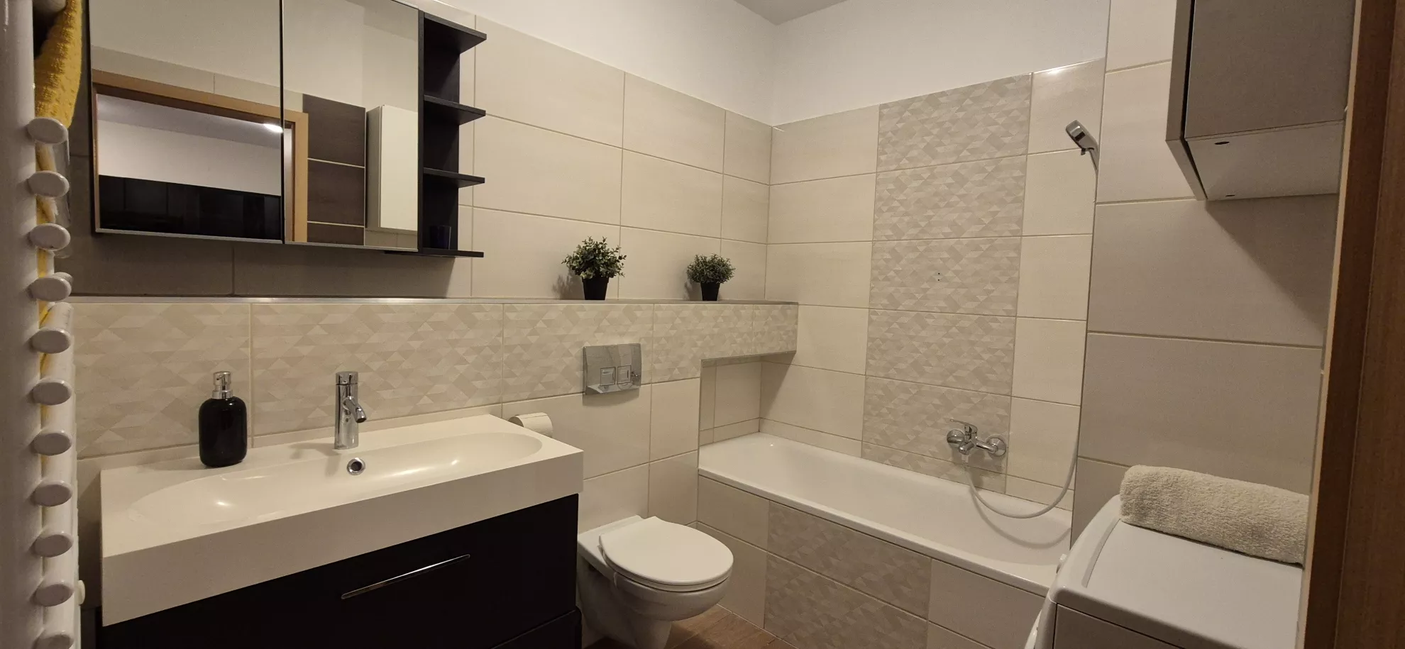 A fürdőszobát minőségi szaniterekkel szerelték, korszerű perlátoros csaptelep, víztakarékos Geberit WC és energiatakarékos IKEA zuhanyfej biztosítják a fenntarthatóságot a kényelem mellett. A kellemes hőmérsékletről törölközőszárítós radiátor gondoskodik, ami extra kényelmet nyújt, különösen a hidegebb hónapokban.